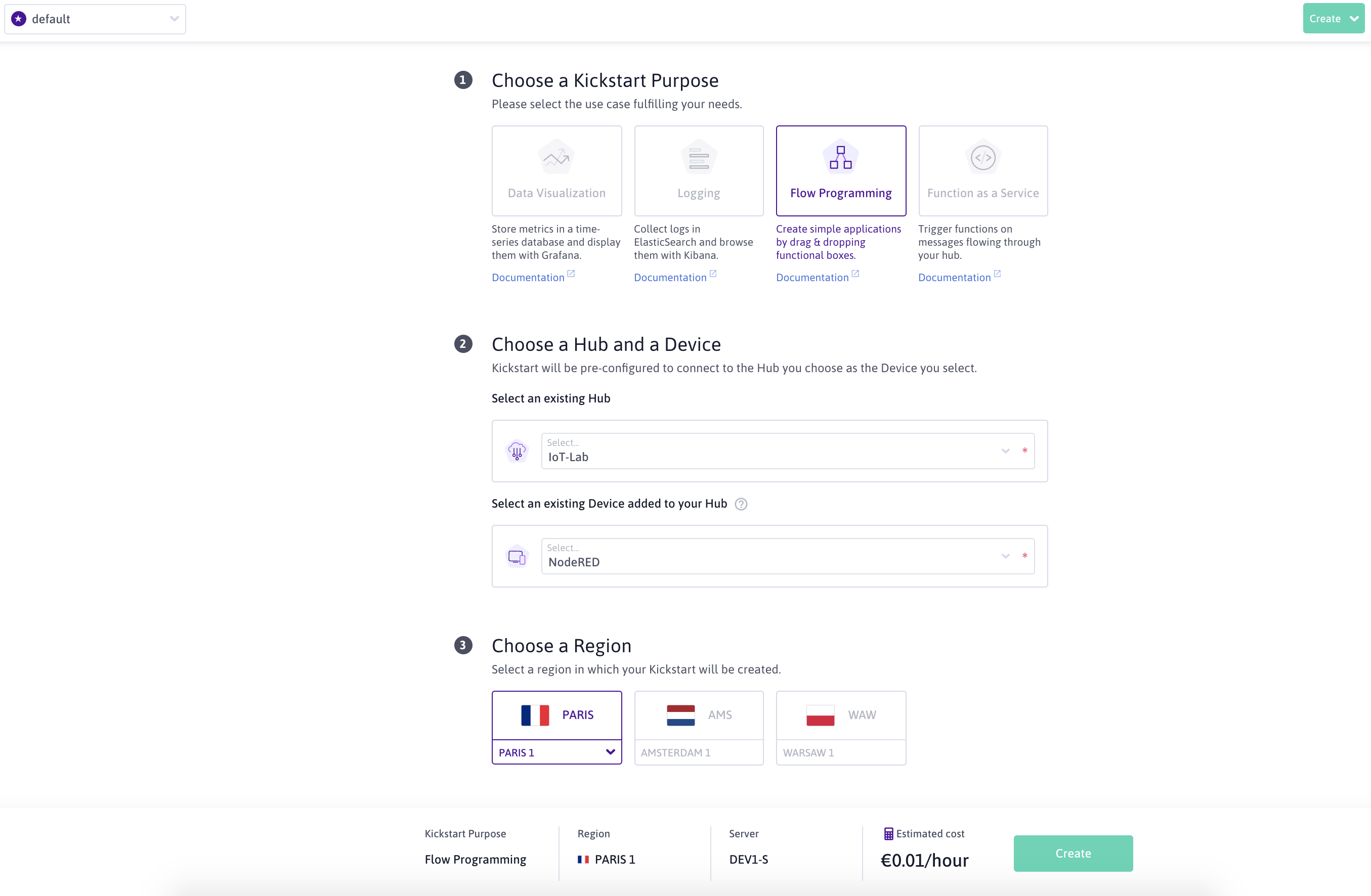 Select the Flow Programming Kickstart and choose your Hub and Device from the drop-down lists. Then select a region for your Kickstart to deploy. Click Create to deploy the Node-RED application on an Instance