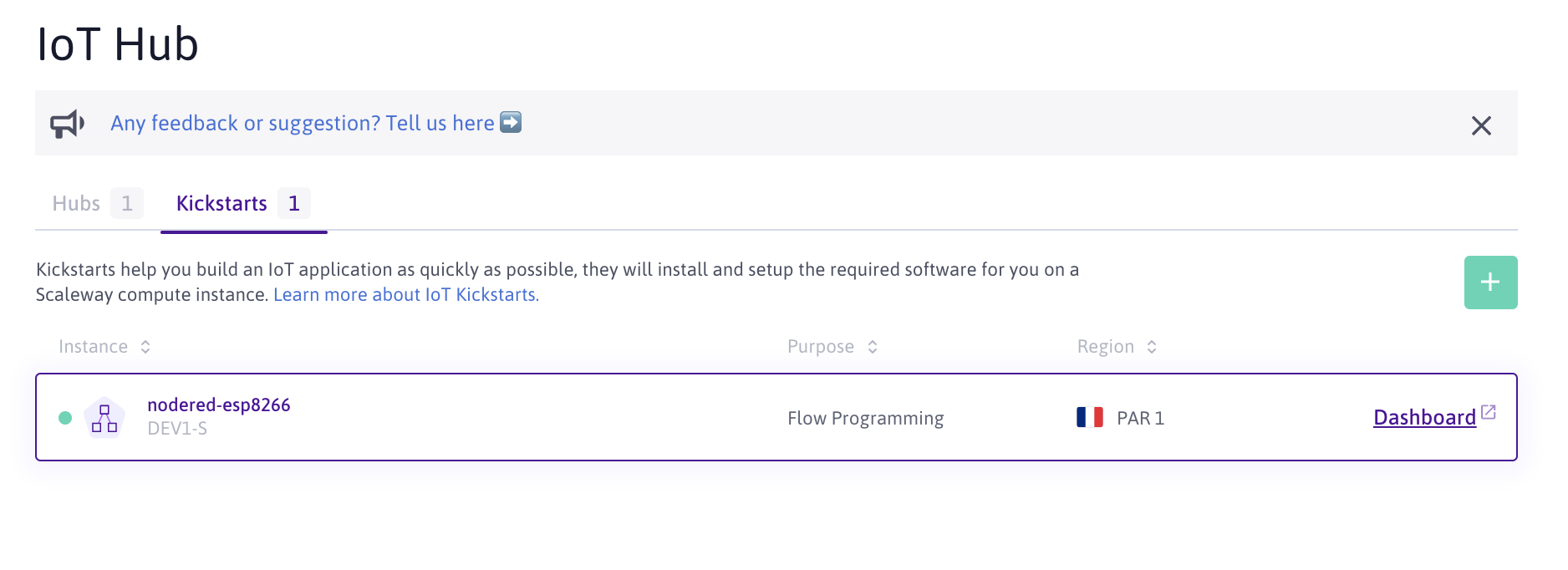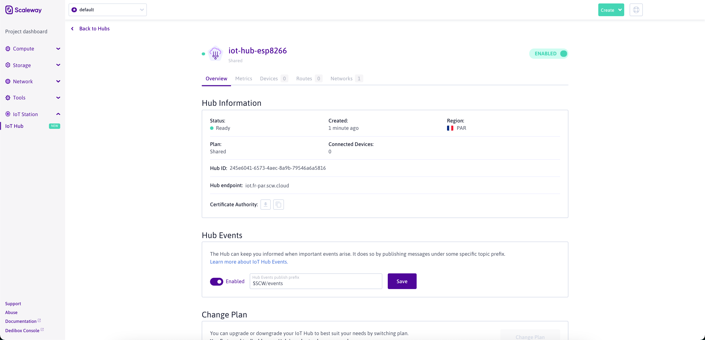 Learn more about Scaleway IoT Hub, discover how to add Devices to the hub, or check the IoT Hub metrics.