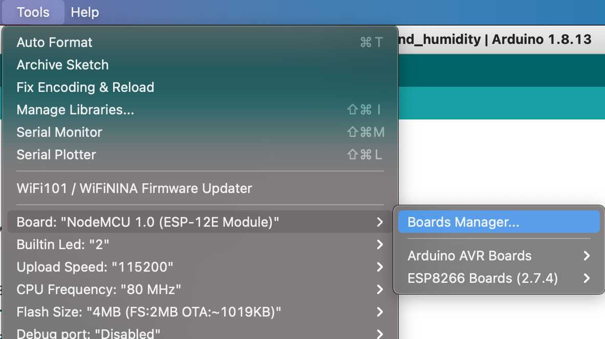 - Enter the Tools menu, then Board and select NodeMCU 1.0 (ESP-12E Module).