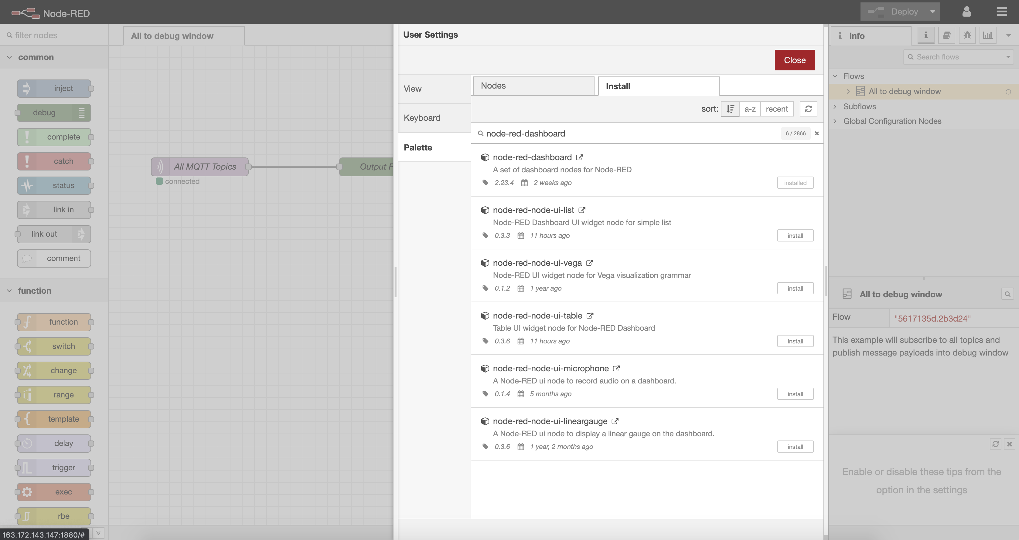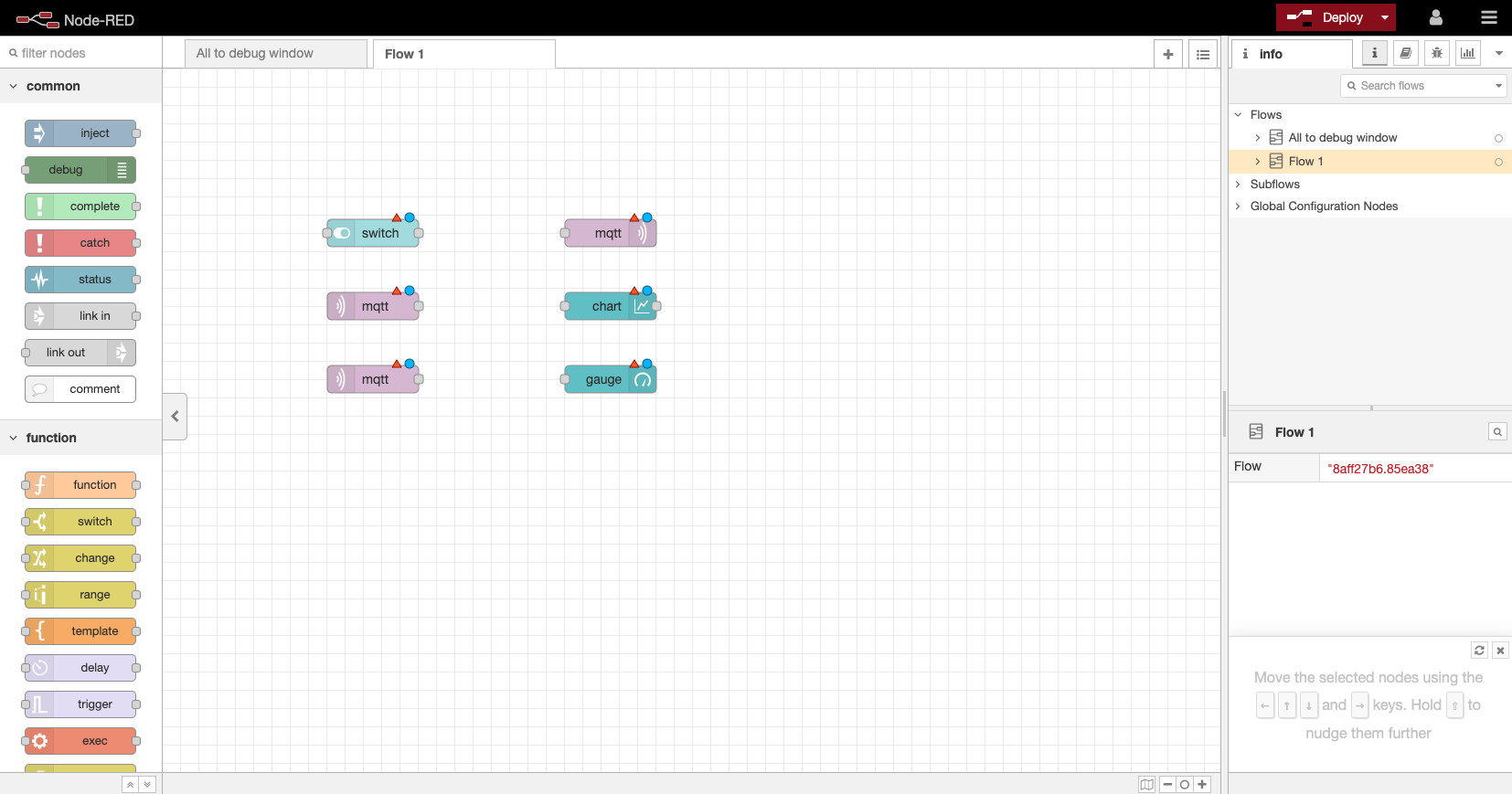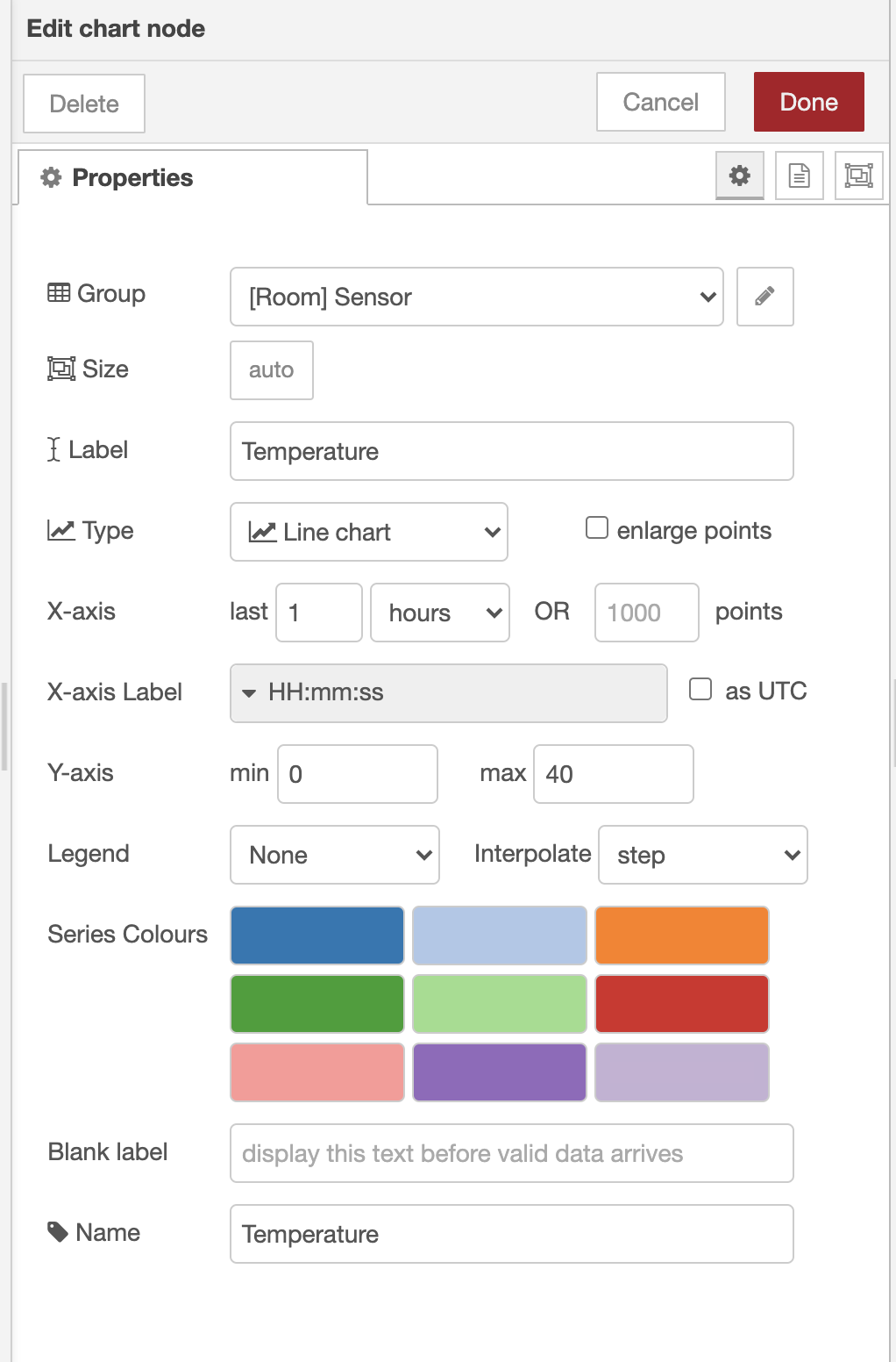 mqtt input nodes– these nodes subscribe to the temperature and humidity topics to receive sensor data from the ESP chart– will display the temperature sensor readingsgauge– will display the humidity sensor readings