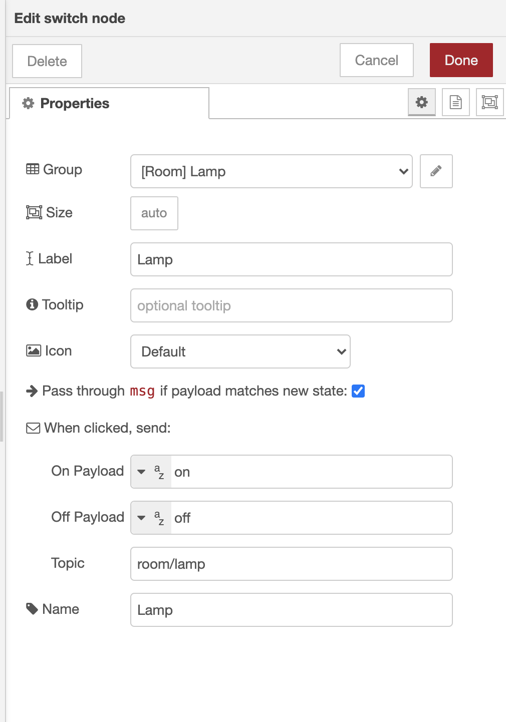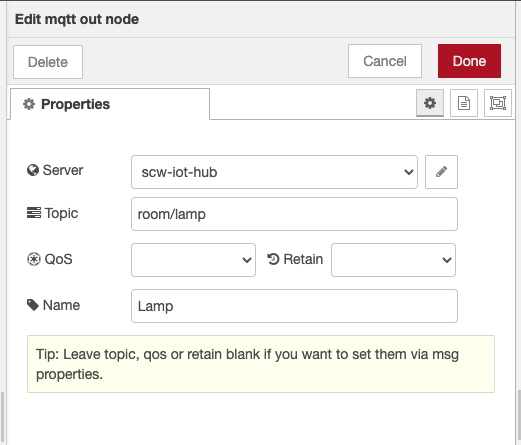 switch– this will control the ESP8266 outputmqtt output node– this will publish a message to the ESP8266 according to the switch state- 2x