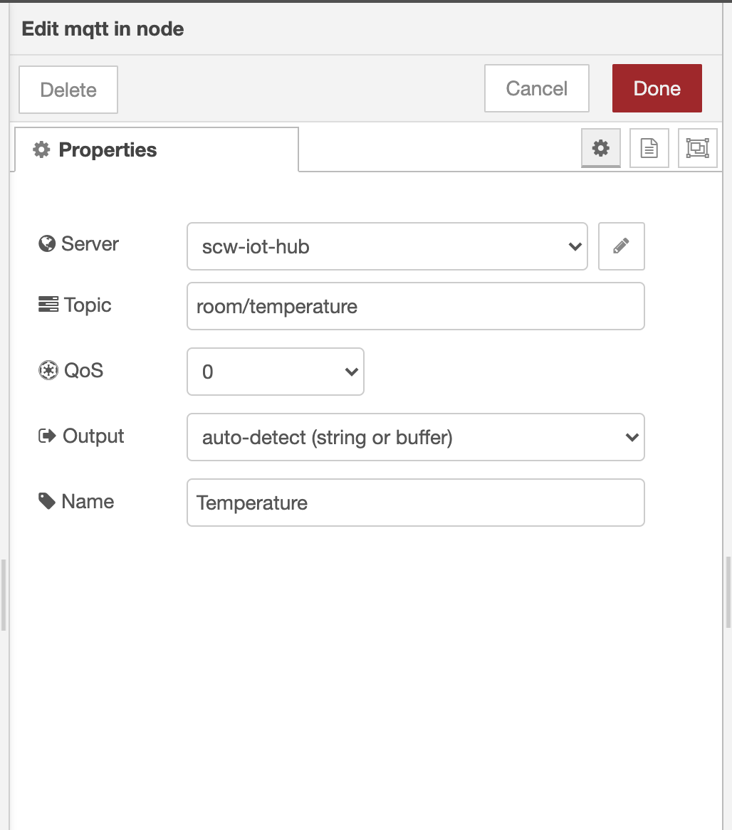 The MQTT Out in Node-RED and the MQTT broker need to be connected. To connect the MQTT broker to Node-RED, double-click the MQTT output node. A new window pops up – as shown in the figure below. It is already pre-configured by the IoT Kickstart, just add the Topic and the Name: