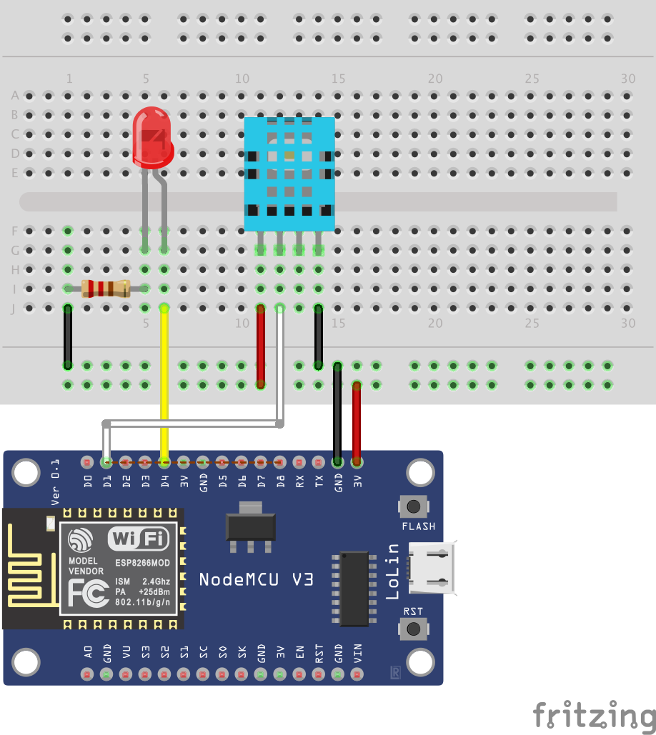 Next, we will use our NodeMCU device to measure temperature and humidity and publish these values in a topic. Besides the NodeMCU device, you need the following hardware for this step:
