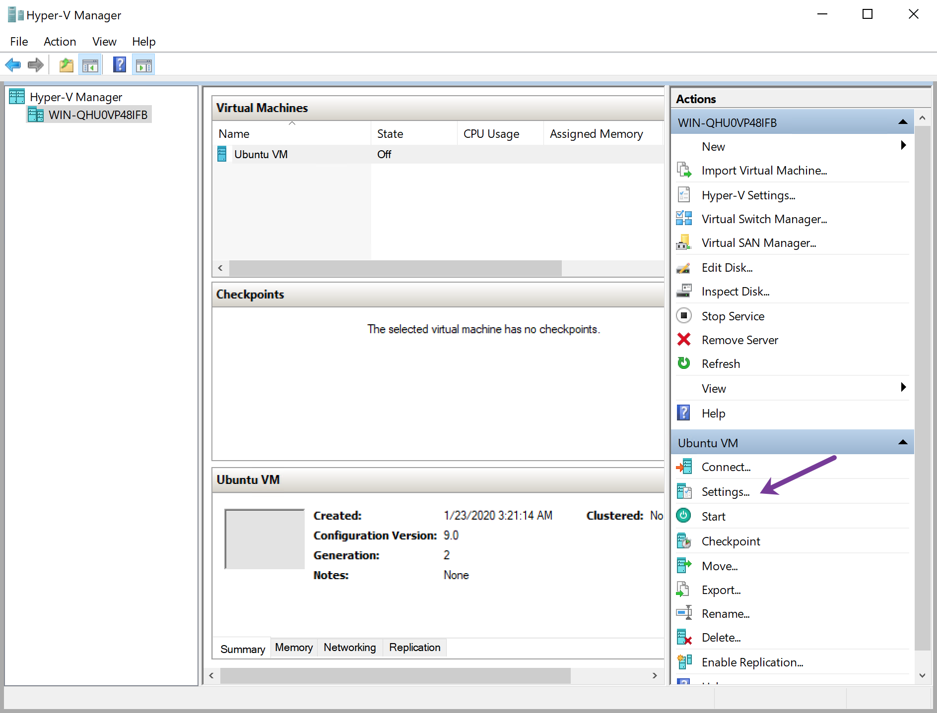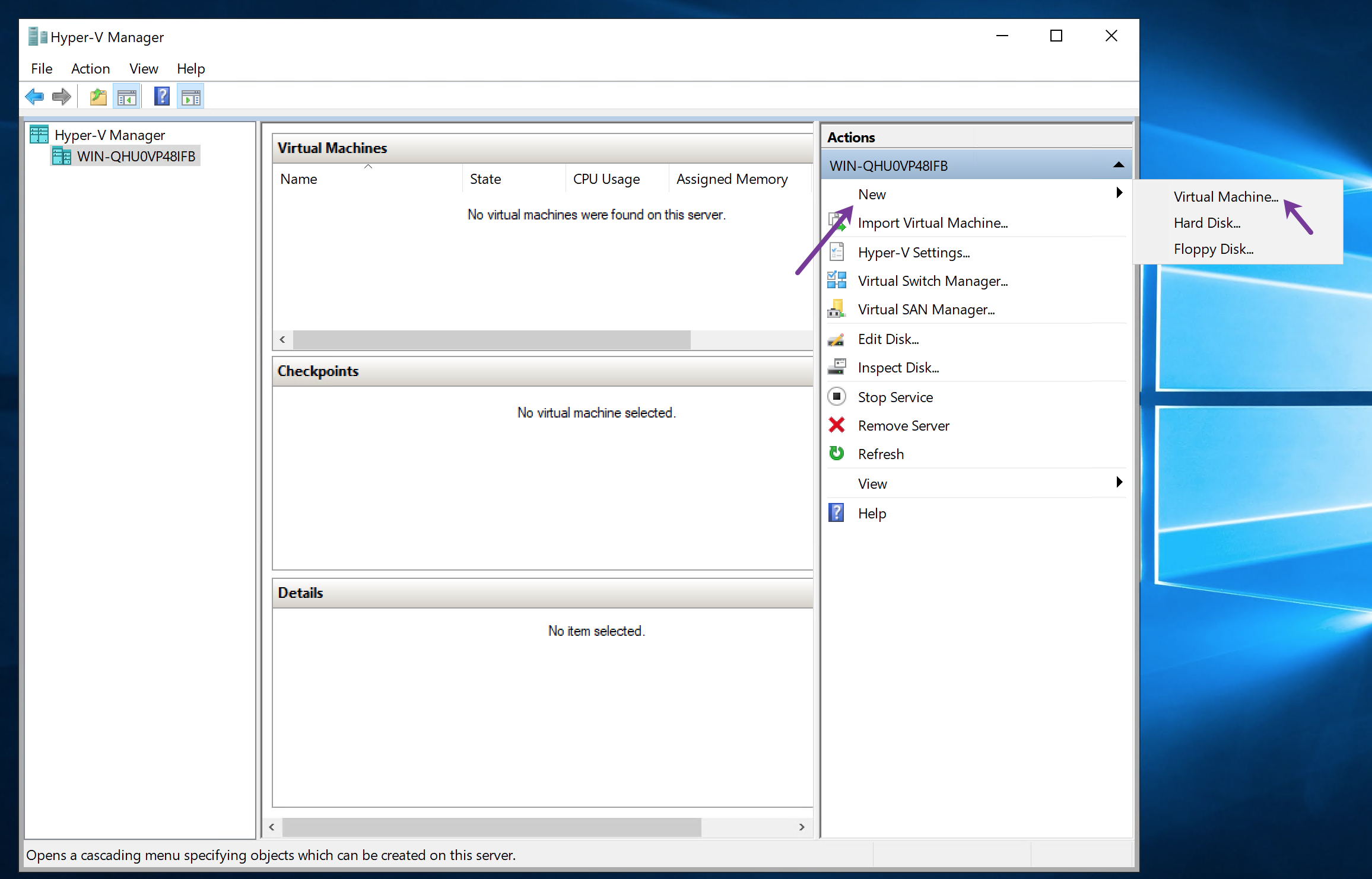 - Click New in the Actions menu, then Virtual Machine in the Hyper-V Manager application to launch the virtual machine creation wizard:
