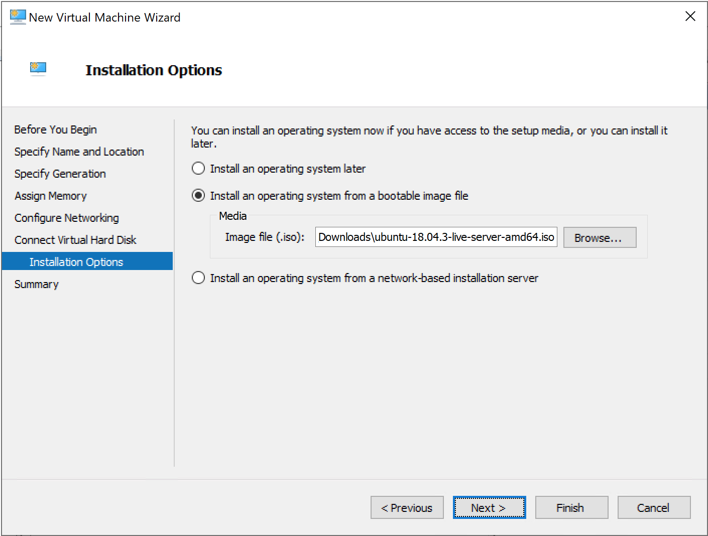 - Choose the installation options for the virtual machine. To create the machine without an operating system, specify a local ISO file or provide information for a network-based installation server. If you have downloaded an ISO file to install your OS, choose the second option and specify the file path before clicking Next. Then a configuration summary displays.