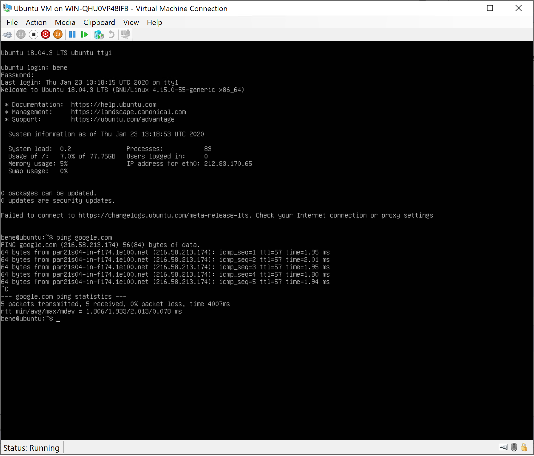 - Configure the virtual networking as described in our documentation once the installation of the guest OS has been completed. Then, you may run a ping test to check the connectivity of the virtual machine: