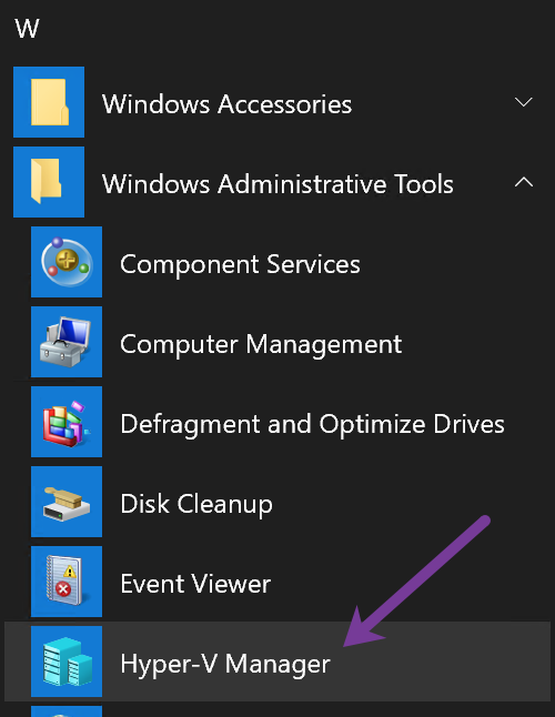 - Connect to your server using the Remote Desktop Protocol once the installation is complete, and launch the Application Hyper-V Manager from the Windows Administrative Tools section of the start menu:
