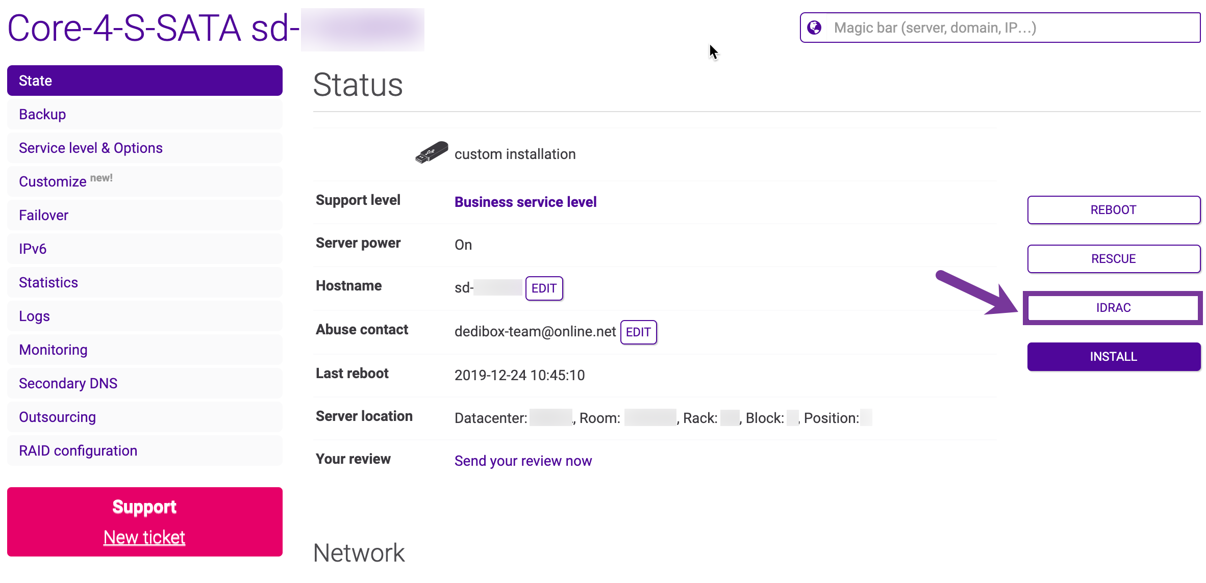 - Click the third button on the right. The model of the KVM over IP device is determined by the brand of your Dedibox chassis. For a Dell chassis, use IDRAC.