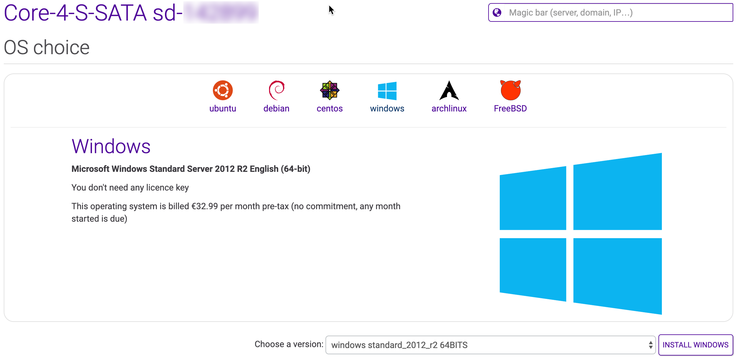 - Select Windows on the distribution menu, then windows standard_2012_r2 64BITS under Choose a Version and click Install Windows: