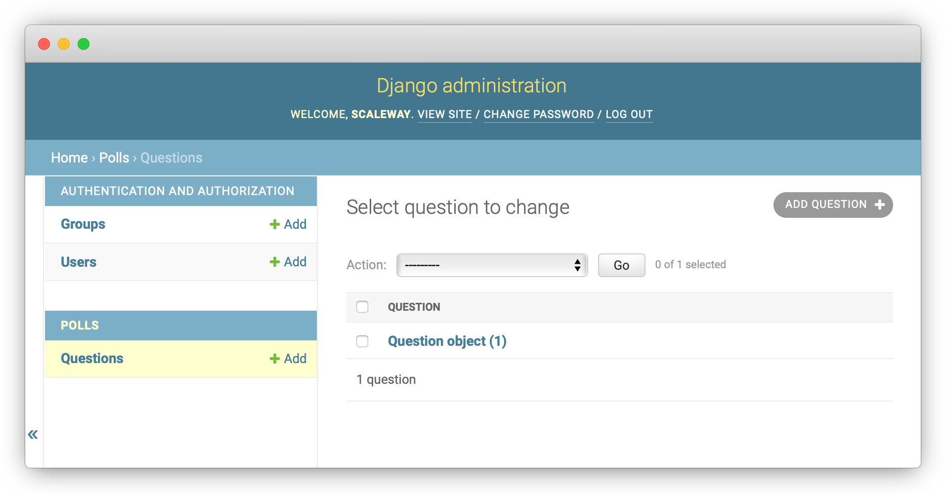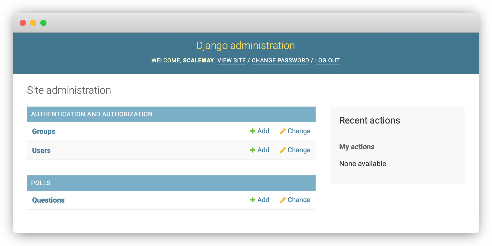 pollapp is not displayed on the admin console. To make it appear, edit thepolls/admin.pyfile to match the following:from django.contrib import admin from .models import Question admin.site.register(Question) -