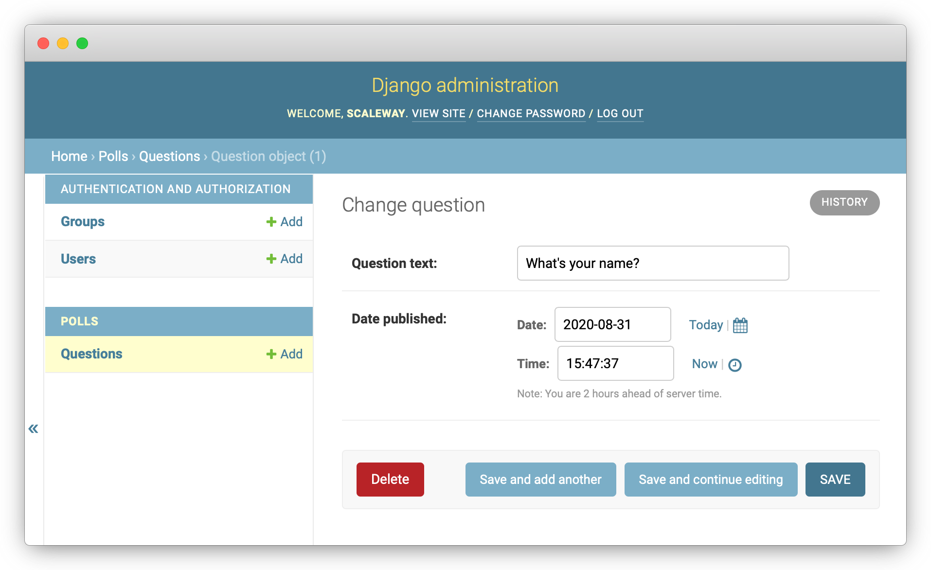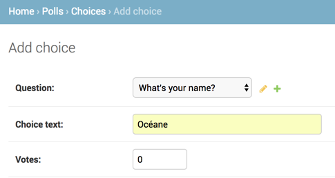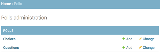 polls/admin.pyfile to add the following:from django.contrib import admin from .models import Choice, Question admin.site.register(Choice) -