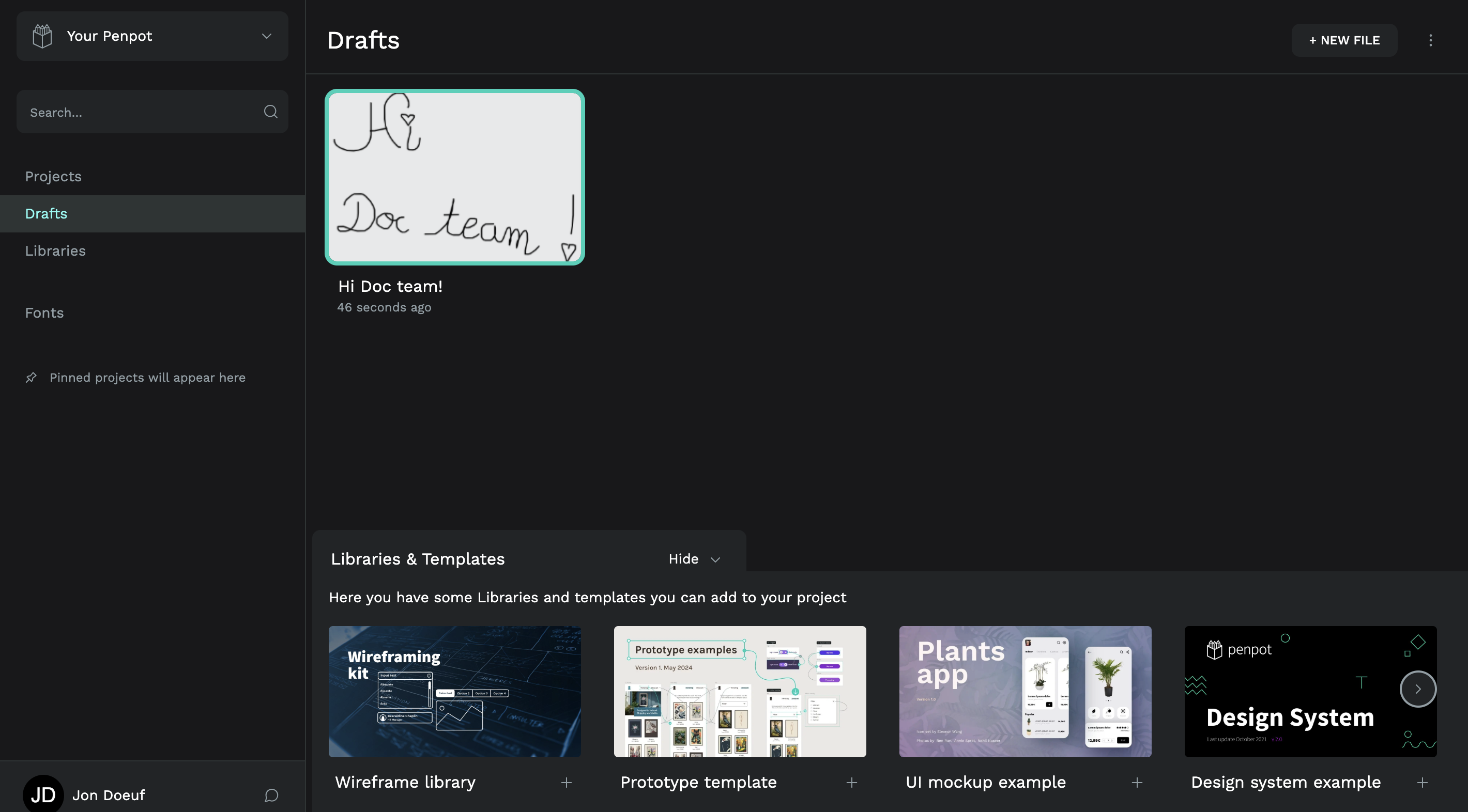 - Enter a name and click Create an account again to confirm. The Penpot dashboard displays. You can now start designing your assets.