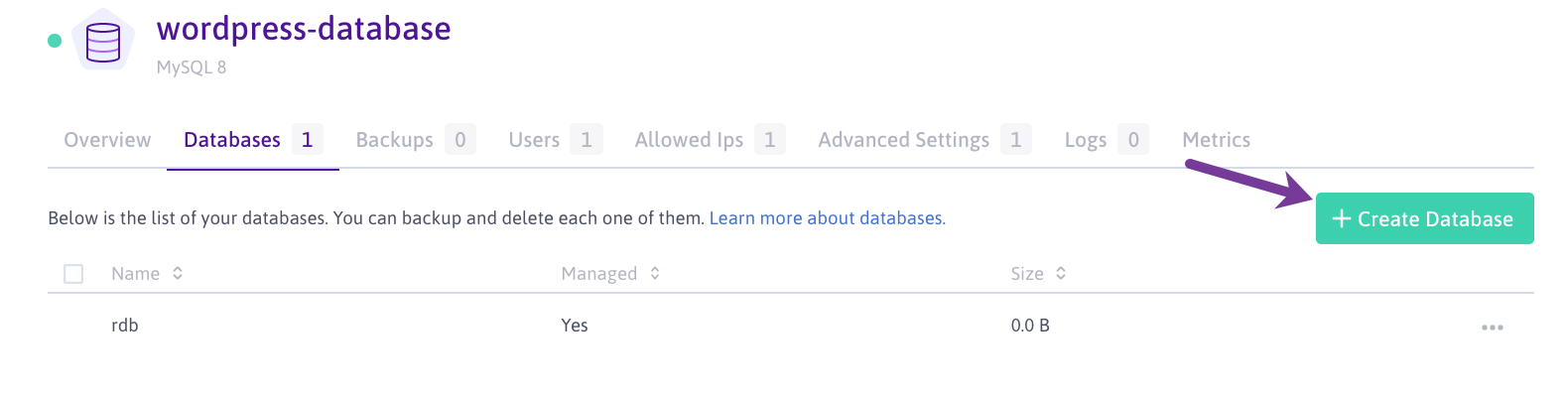 - Click the Managed Databases tab. A list of your existing databases displays. Click + Create Database to create a new database: