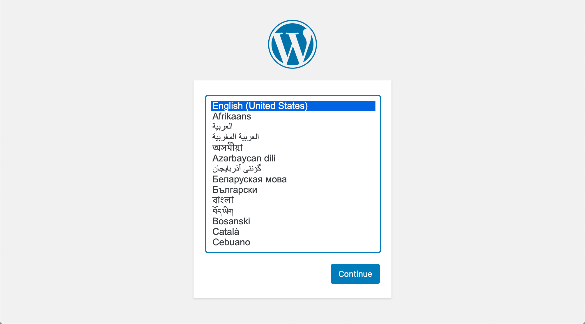https://blog.example.com). - The WordPress installation wizard displays. Choose the desired language for your blog from the list and click Continue: