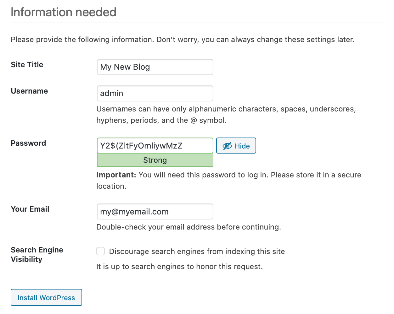- Enter the details of your new blog, such as the title, choose a name for the admin user, and set a secret password. Then click Install WordPress to complete the installation of your blog: