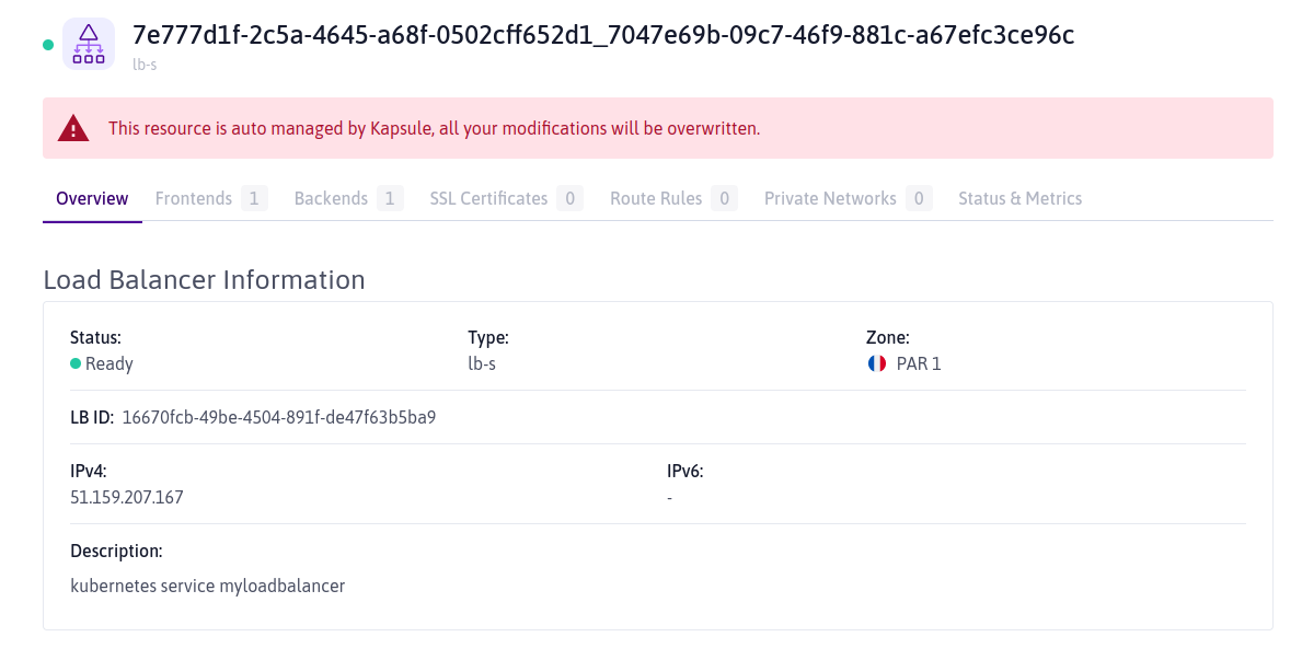 The Load Balancer is auto-managed by Kapsule, so no changes can be made here directly.