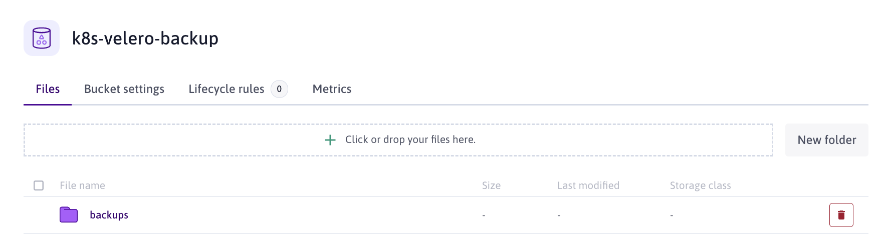 velero get backupcommand:When you go to your Object Storage bucket in the Scaleway console, you notice the$ velero get backup NAME STATUS ERRORS WARNINGS CREATED EXPIRES STORAGE LOCATION SELECTOR full-backup Completed 0 0 2023-06-02 15:33:45 +0200 CEST 29d default <none>backupfolder created by Velero: