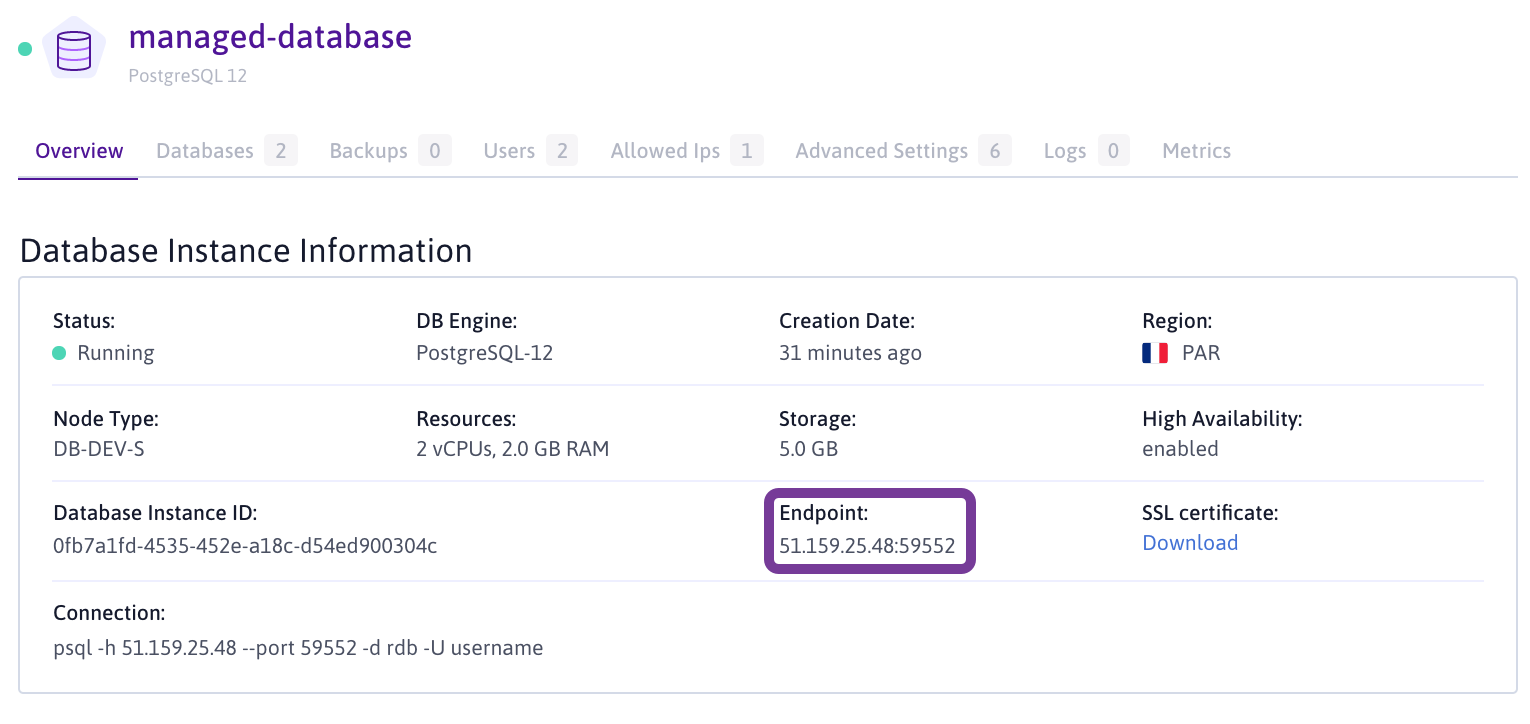 Retrieve the database host and port from your Scaleway console. The Endpoint information is visible on your Database information page: