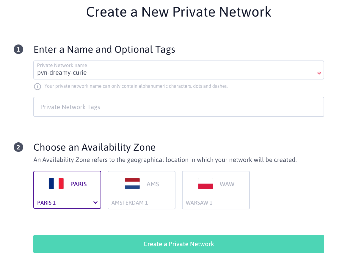 Enter the details of the Private Network. Make sure to create the Private Network in the same geographical region as your Instances: