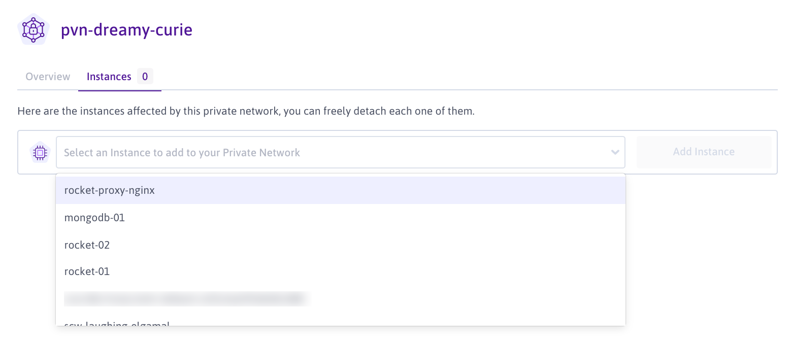 Select the newly created Private Network from your networks list. From the drop-down list, click the CPU & GPU Instances tab to add your Instances: