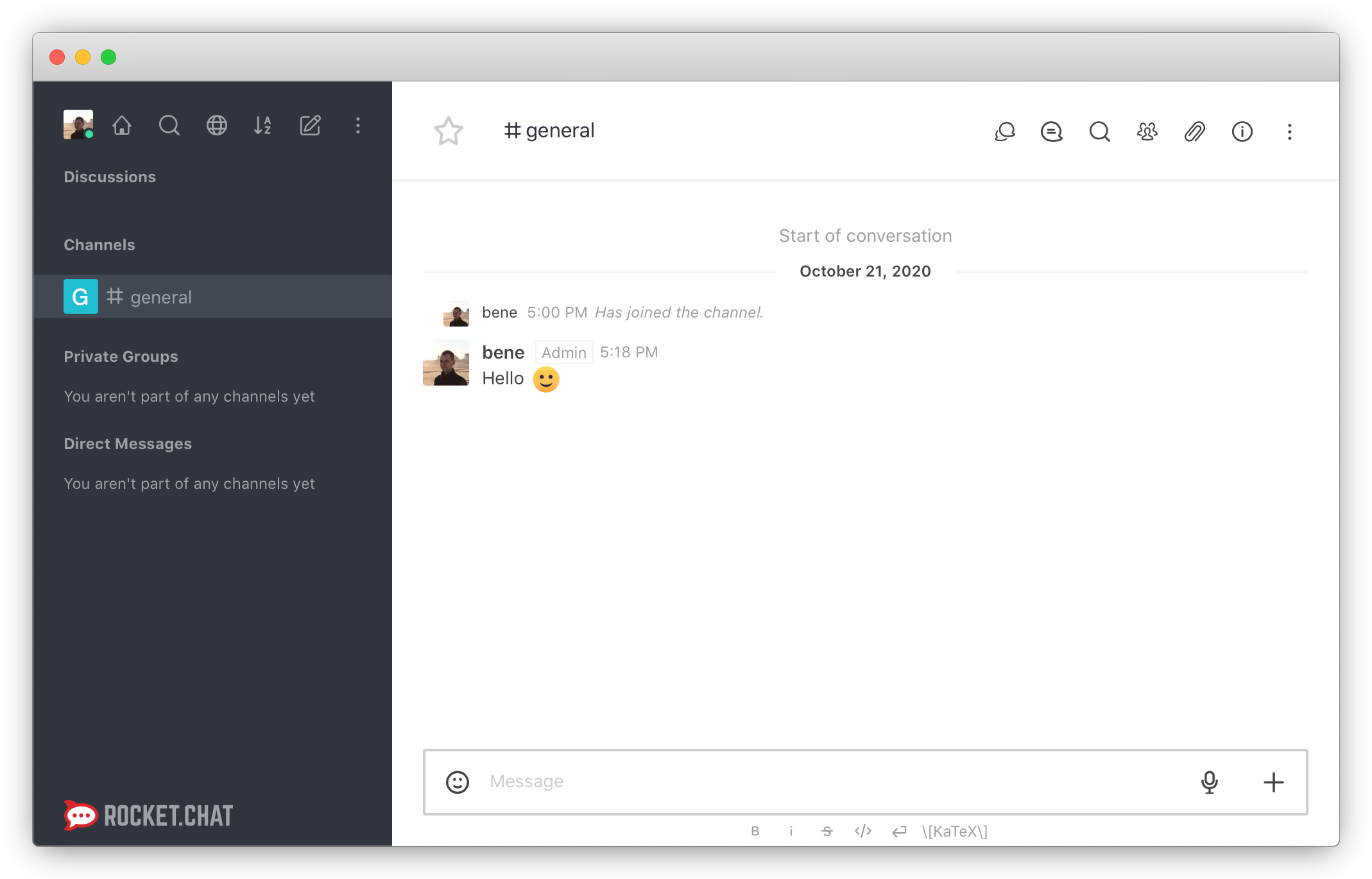 - Once you complete all steps, you are automatically logged into your Rocket.Chat application. You can start chatting now and invite other users to your community: