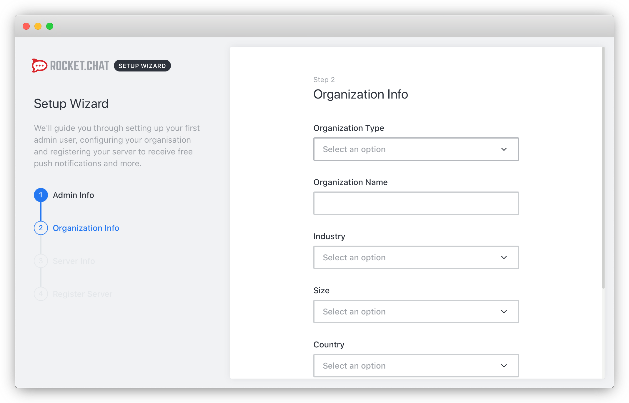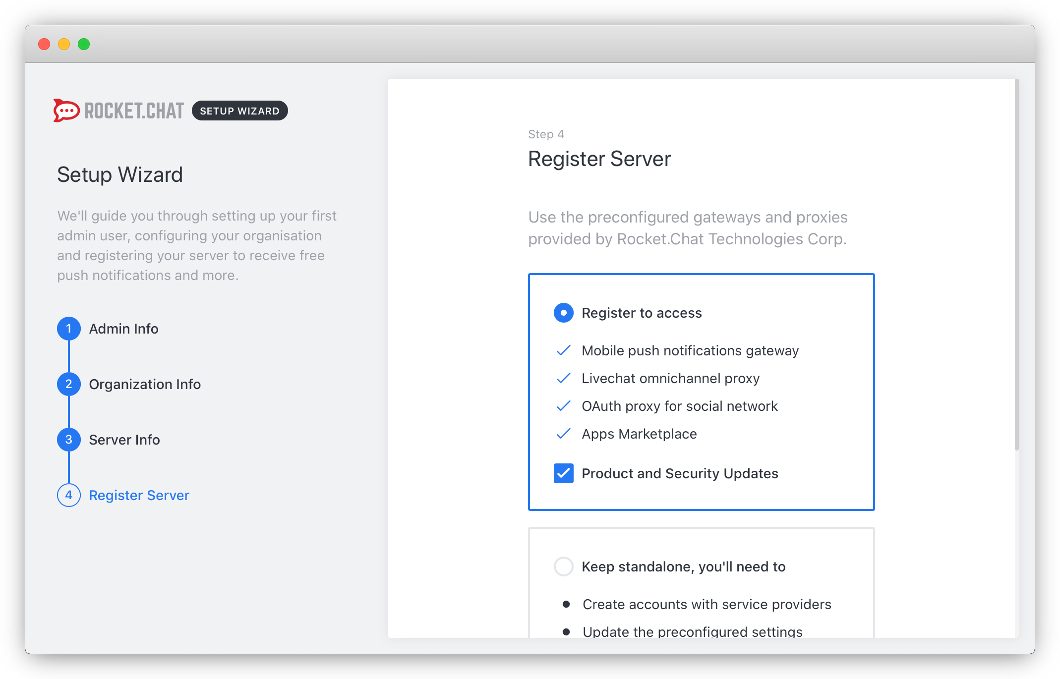 - You can either register your server with Rocket.Chat to have access to additional services or keep it as a standalone solution: