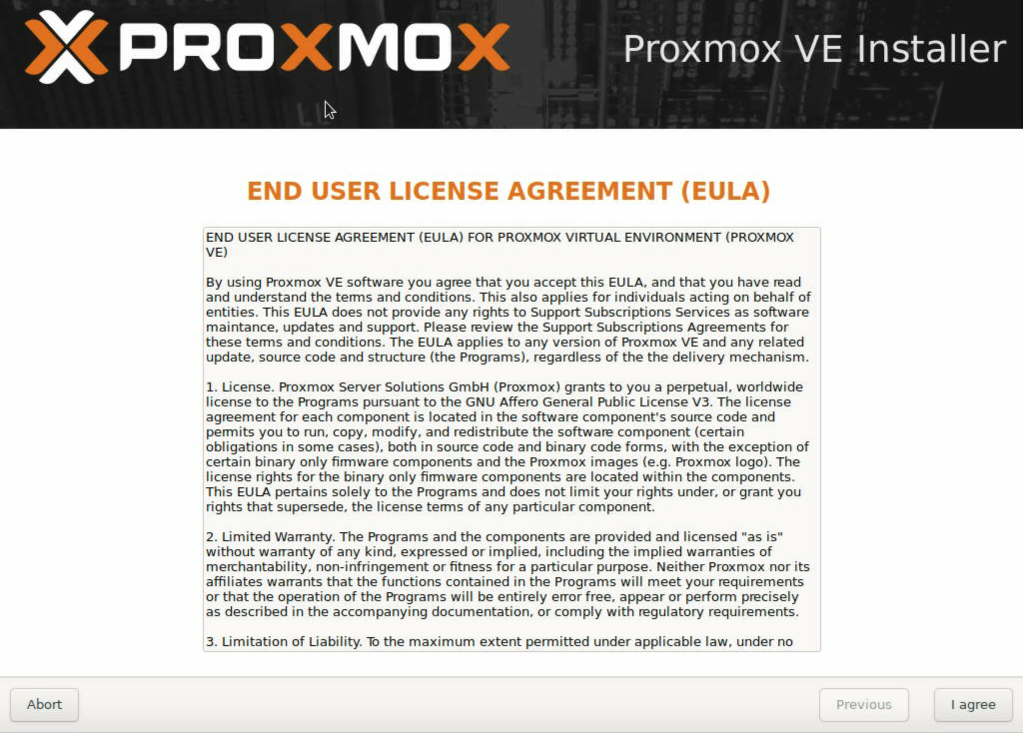 The Proxmox EULA displays. Agree to it by clicking I agree. A summary of the Proxmox installer displays.
