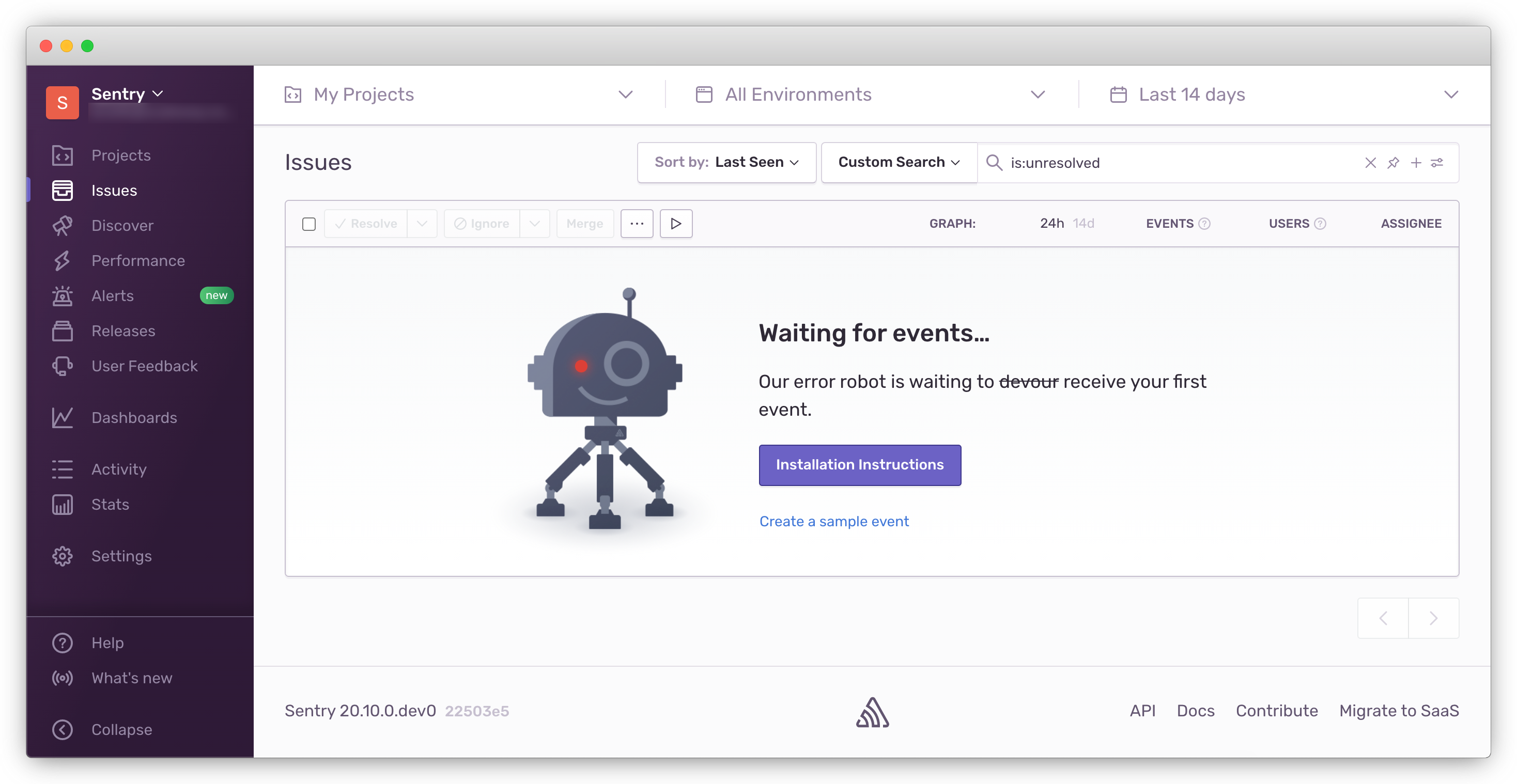https://sentry.example.com/once the installation completes. - Log in with the user created during the installation.