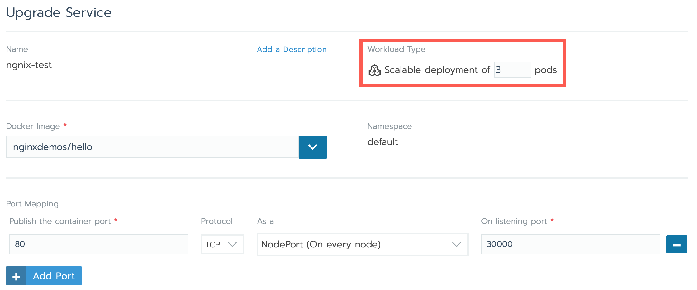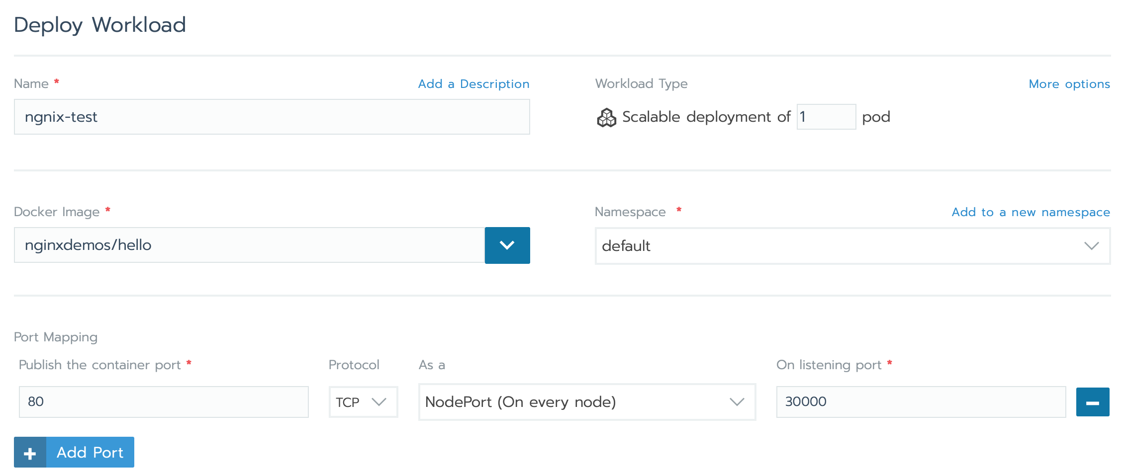 nginxdemos/helloto deploy a demo Nginx application. - Under Port Mapping, click Add port and set the following: