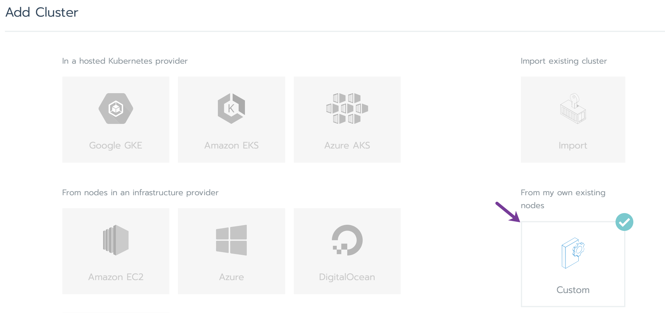- In the Rancher UI, click Add Cluster to start configuring your new Kubernetes cluster.