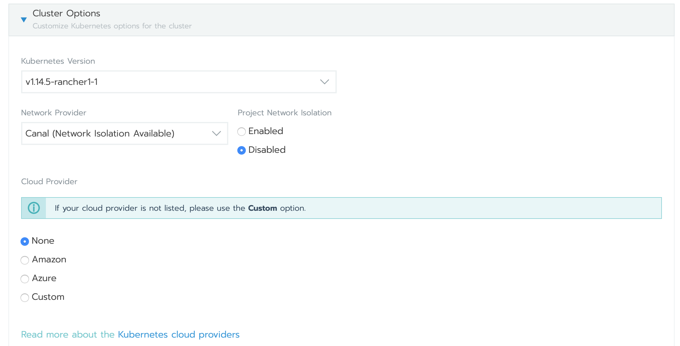 - Name the cluster, choose the desired Kubernetes version, and select None for the cloud provider (since this is a custom setup).