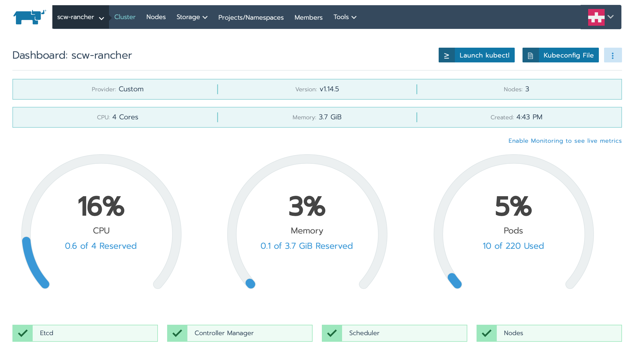 - When the cluster is initialized, the dashboard will display: