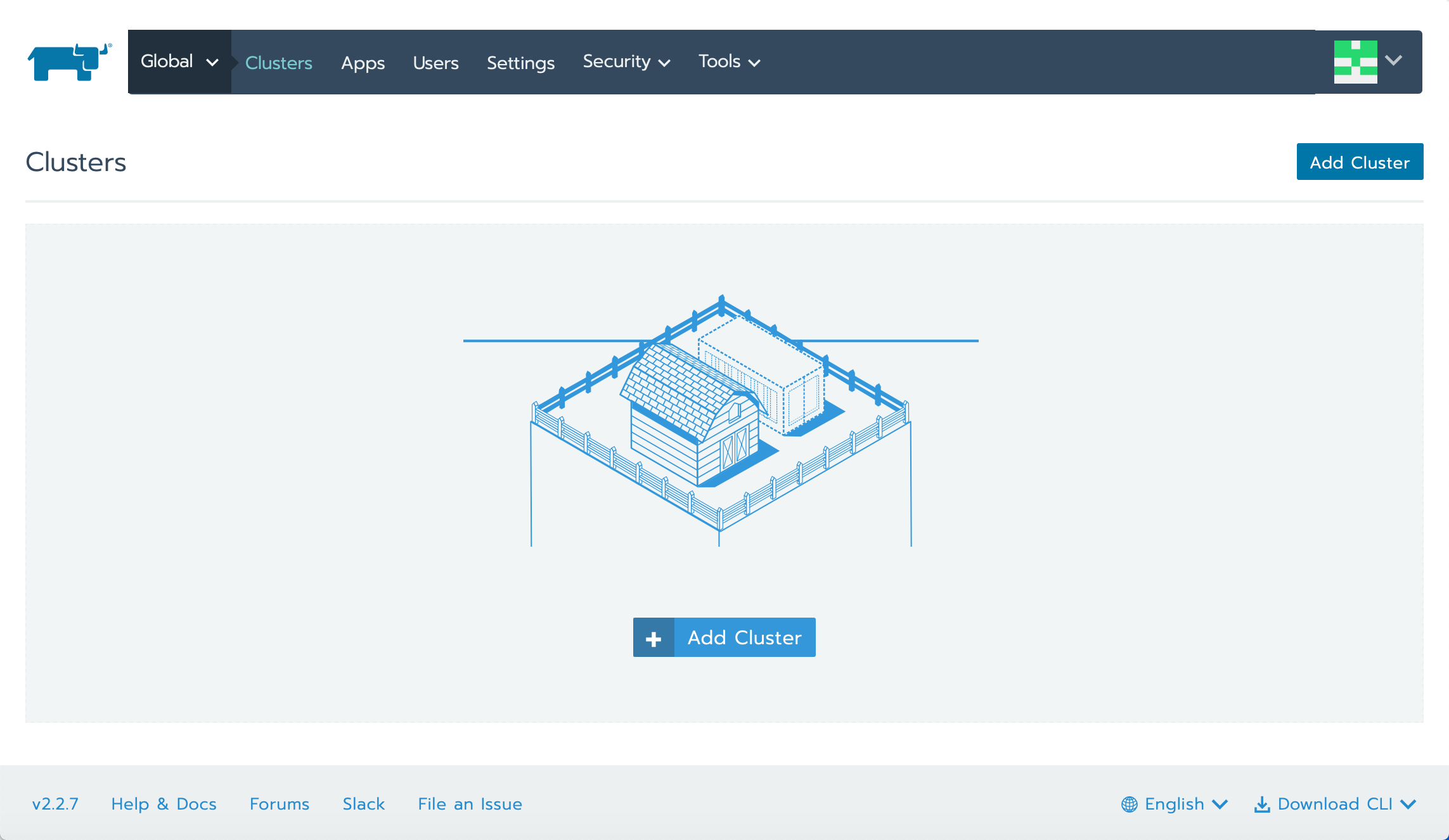 - The empty Rancher dashboard will display: