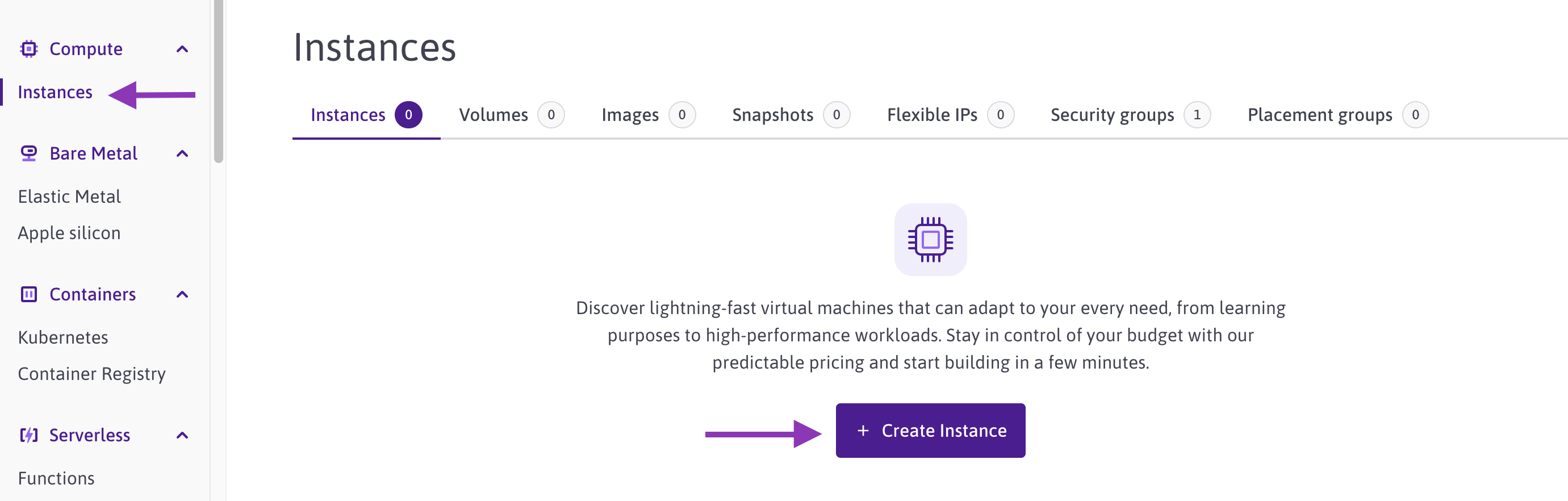 - Click CPU & GPU Instances in the Compute section of the side menu. The Instances page displays.
