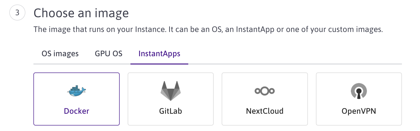 - Click the InstantApps tab, and choose the Docker image: