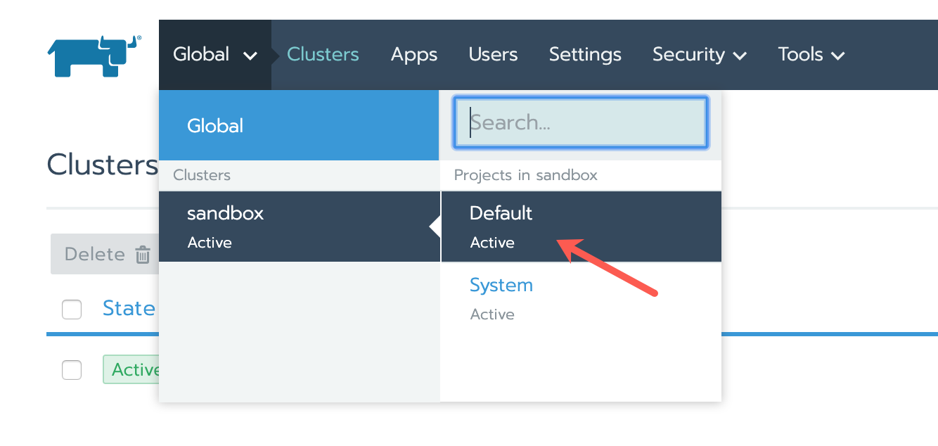 - In the top navigation bar, click Global, select your cluster, then choose Default from the drop-down menu: