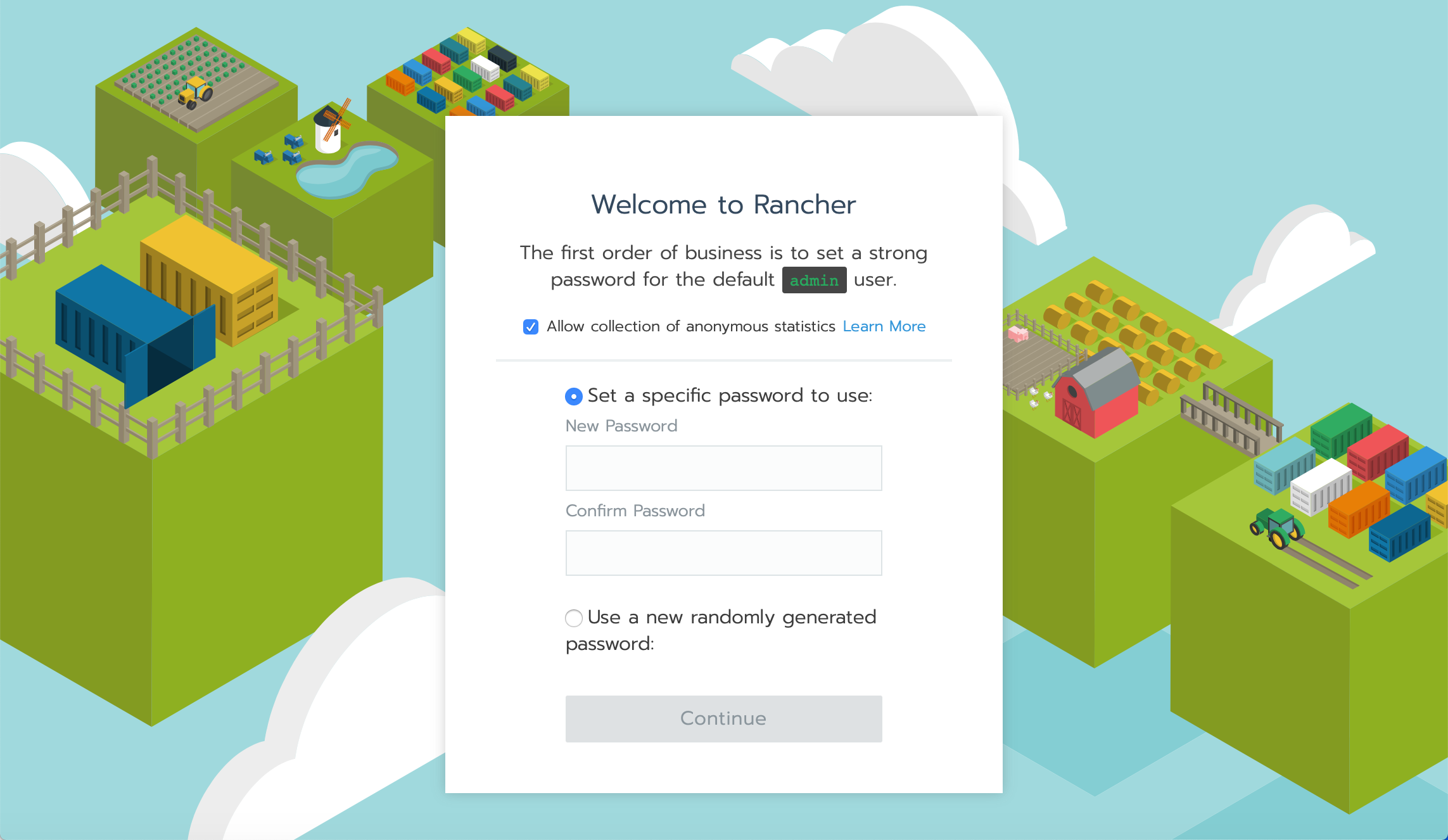 https://rancher.example.com). You will see the Rancher setup page: