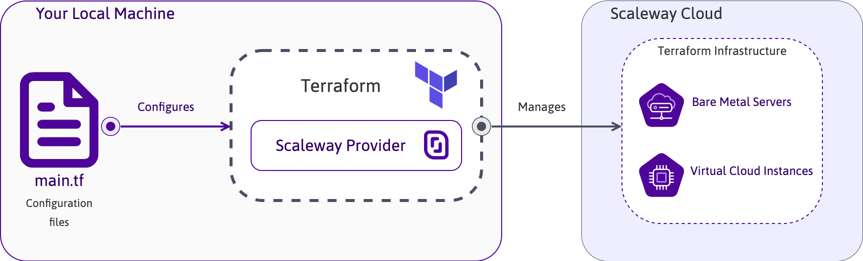 To create a first Instance using Terraform/OpenTofu, you need a declarative configuration file. This file contains all the information on machine characteristics required to deploy. It has to be written in the Hashicorp Configuration Language (HCL). The deployment of Scaleway resources is done using the Scaleway Provider for Terraform/OpenTofu. For more information about HCL, refer to the official documentation.