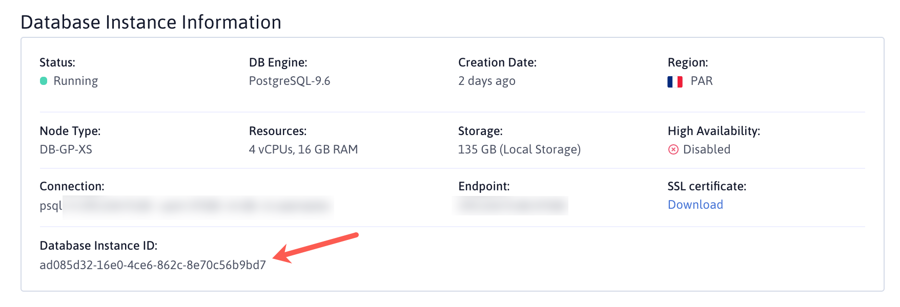 Retrieve the database ID of your new Database Instance. You can find it on the Database Instance Information page of your Instance.