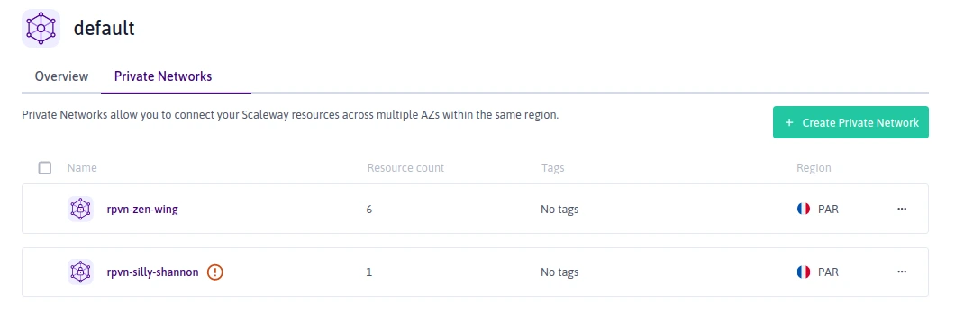 Click VPC in the Network section of the Scaleway console side menu. A listing of your VPCs displays.