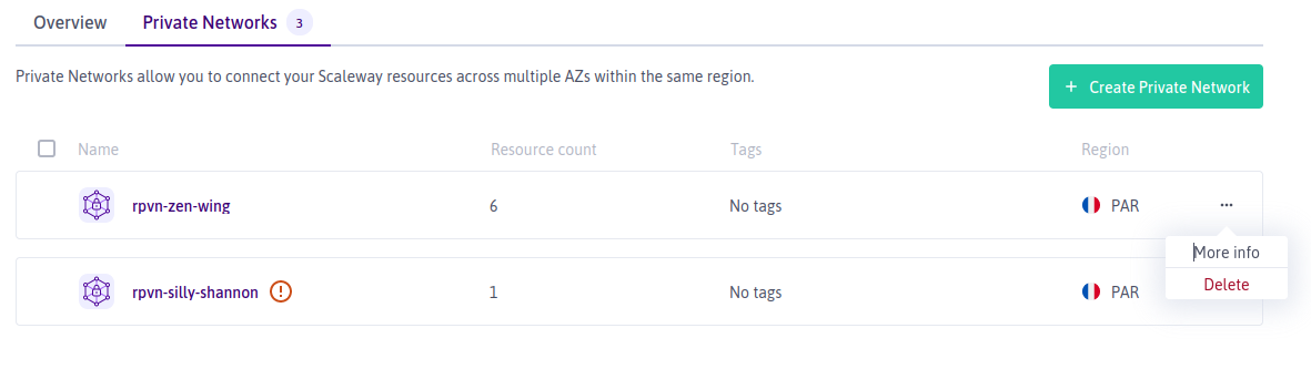 Click the more icon icon next to the Private Network you want to delete, then click Delete on the pop-up menu.