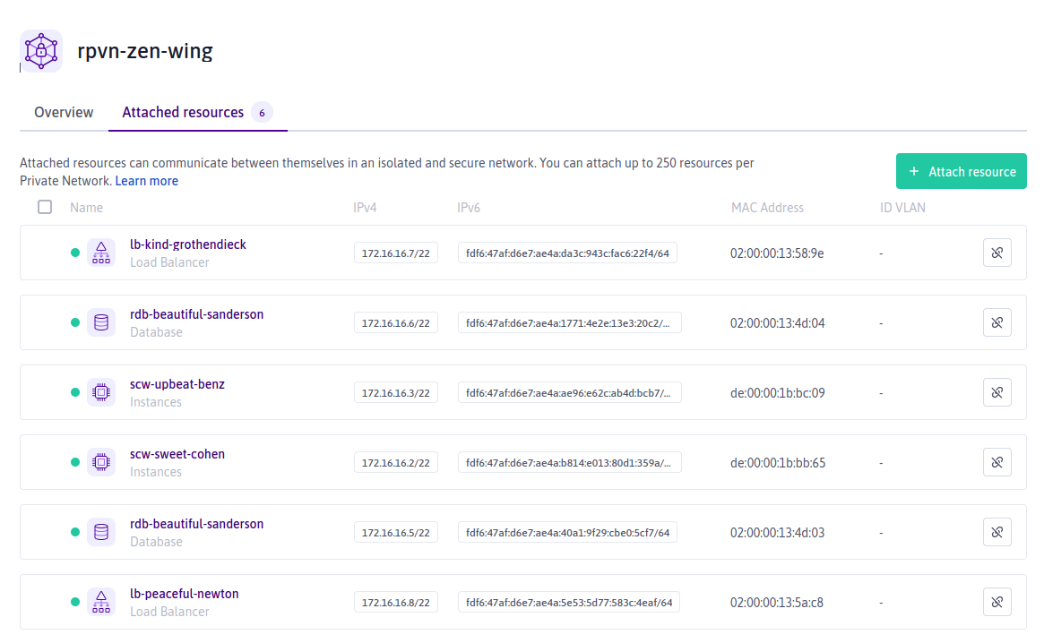 You can also attach custom resources, such as virtual machines hosted on your Elastic Metal server, to Private Networks, by specifying their MAC addresses upon attachment. Follow the instructions for attaching such a resource in the Private Networks documentation.