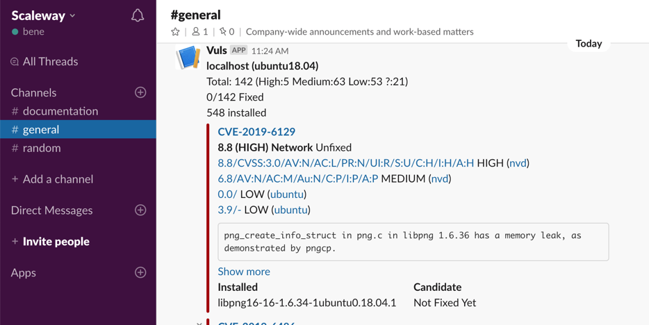 Vuls can send notifications on Slack channels, by using Webhooks.