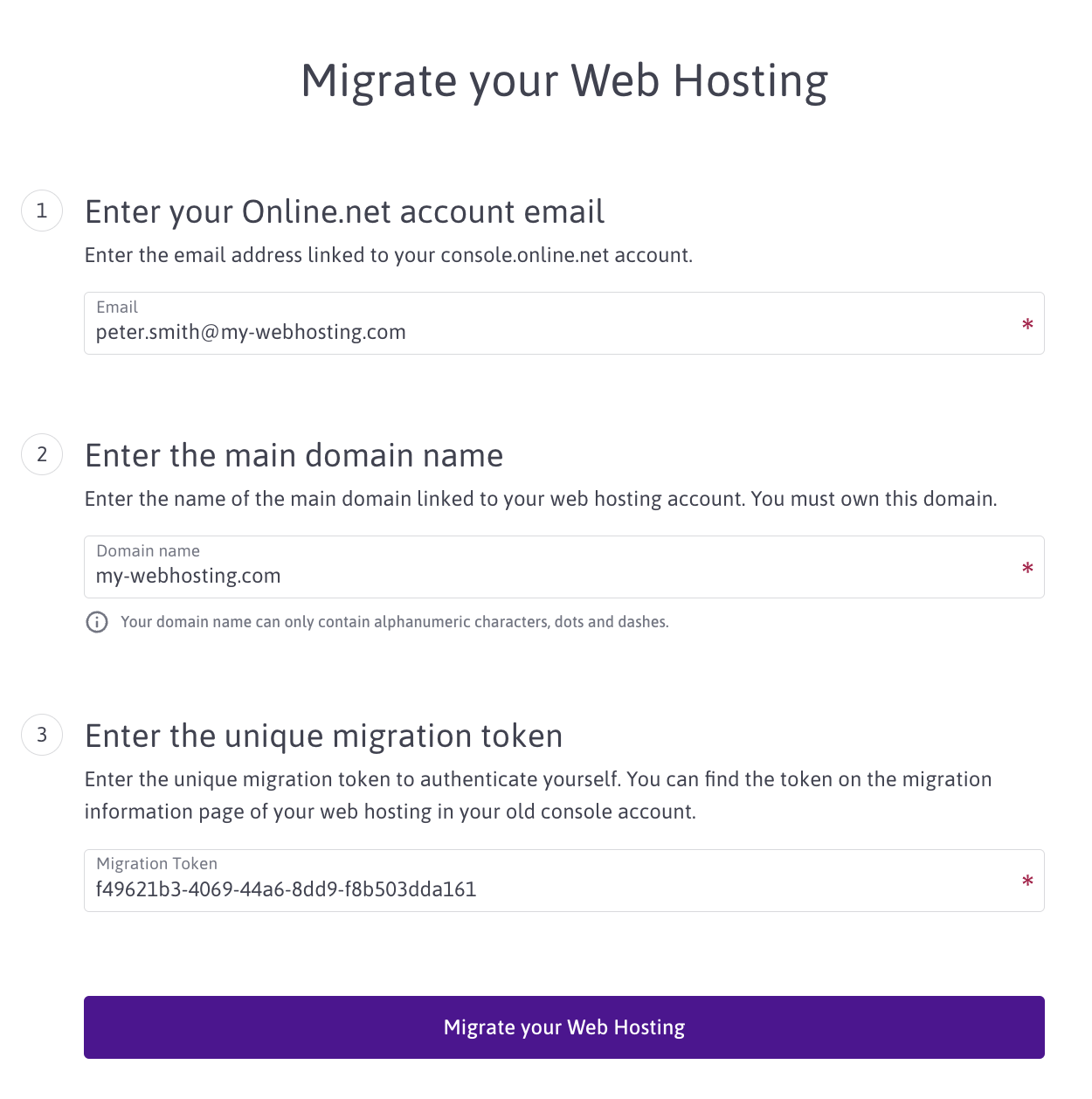 Click Migrate on the web hosting overview. A pop-up appears.