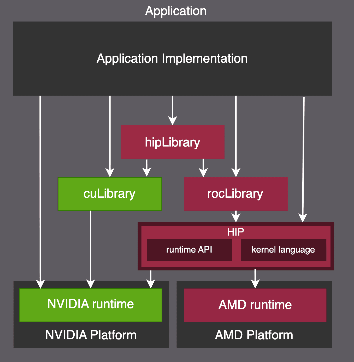 The ROCm environment shares many similarities with CUDA. The reason for this is that CUDA became so popular over the years that it ended up setting the market’s expectations for what a productive GPGPU environment should offer. As a result, HIP (Heterogeneous-computing Interface for Portability) — ROCm’s programming model — was designed to be highly interoperable with CUDA, as depicted below.
