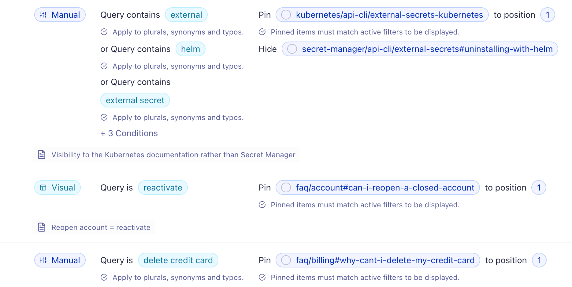 We’ve also been working with Algolia rules, which allow us to fine-tune search behavior based on user intent. With rules, we can boost or demote specific results, pin important content, or filter responses depending on the query. We use synonyms to support our bilingual audience, for example, linking “moyen de paiement” to “carte bancaire”. On top of which, we translate common French queries into English behind the scenes, ensuring relevant results even when users search in a language other than our docs.