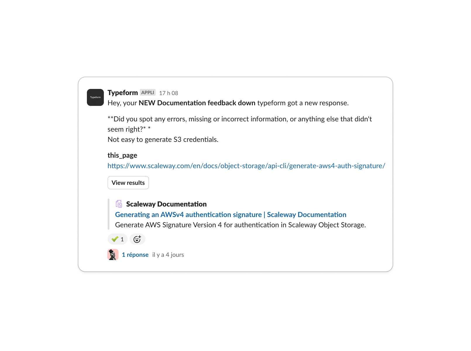 To make reviews more actionable, we revamped our feedback system by embedding a feedback form directly on each documentation page. When someone submits feedback, a real-time notification is sent to our internal #documentation Slack channel. This means the technical writer responsible for this product is instantly informed and can quickly act on the suggestion, whether it's a fix, a clarification, or a request for new content.