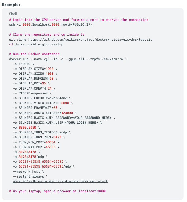 You just have to run the container. And with only one docker run command, you have a remote desktop server fully operational. Optionally, if you want to encrypt the connection, you can use an ssh tunnel to do port forwarding.