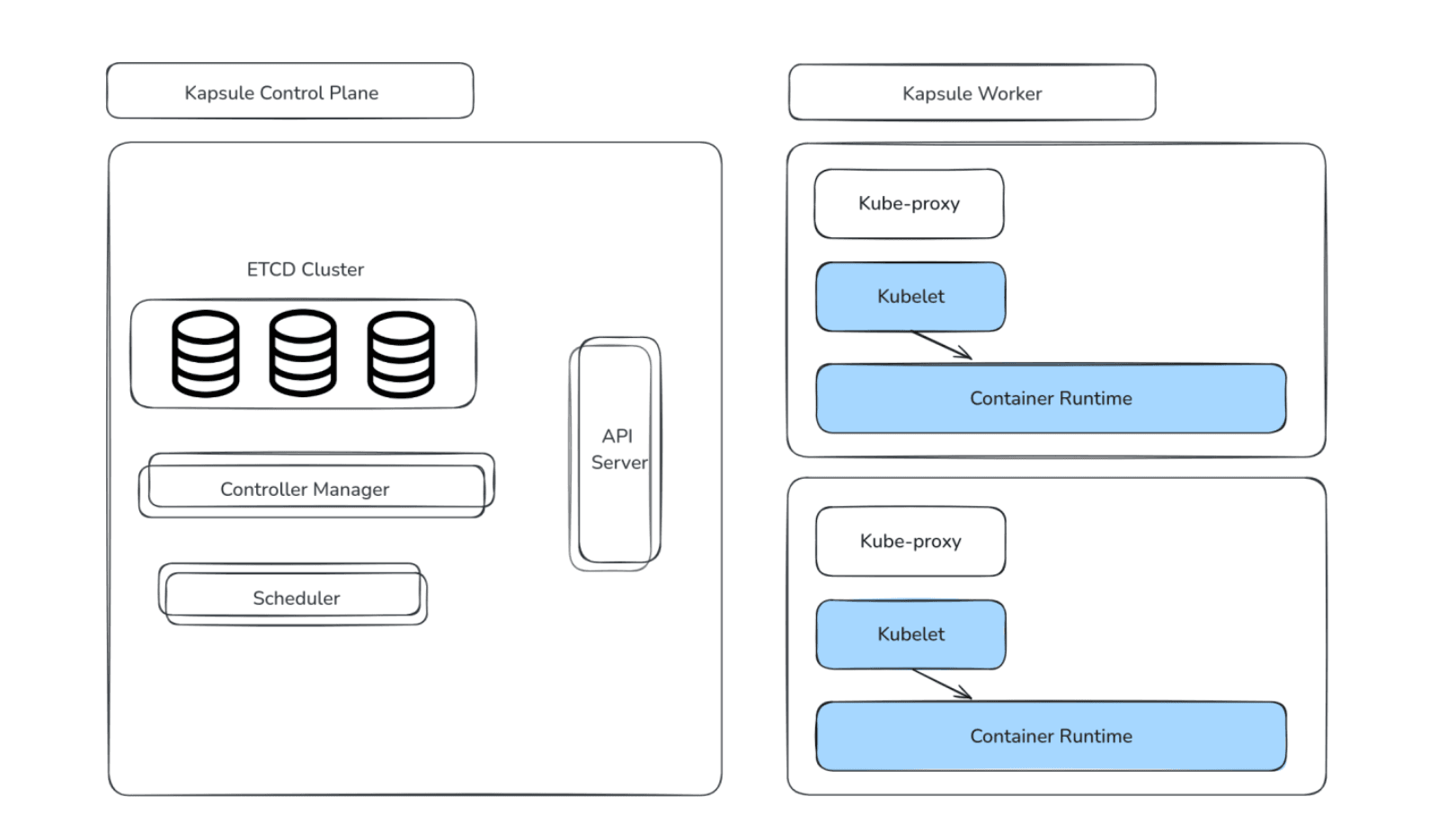 Here is an overview of a Kapsule cluster, consisting of the Control Plane (Master) and the nodes (Workers) on which the workloads are executed.