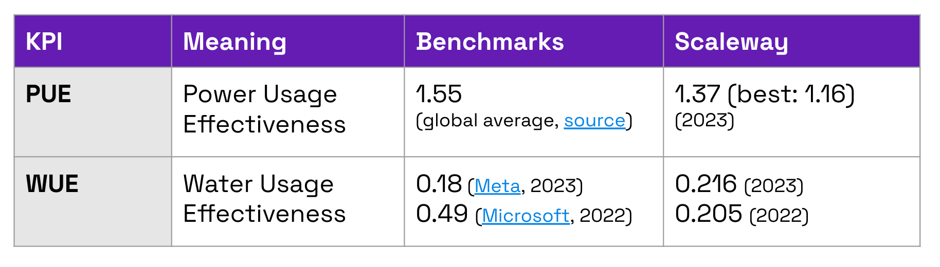 It is as such essential to limit data centers’ impact. Whilst the first way to do that is to choose countries with the lowest-carbon electricity (cf. introduction), you can then check how efficiently your chosen cloud provider (CSP) uses energy. This is measured with Power Usage Effectiveness, or PUE. As it’s a ratio, the closer it is to one, the better it is (cf. examples, above).